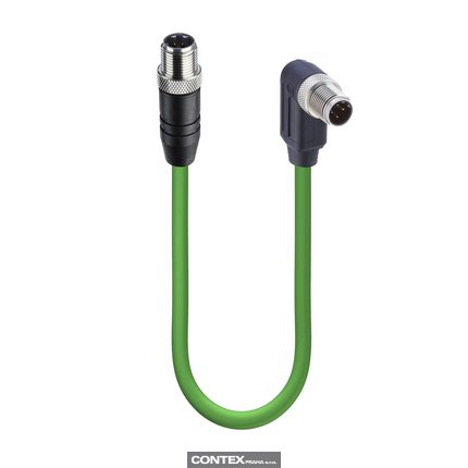 Fast Ethernet Cat5e Data Double-Ended Cordset: Male straight D-coded black M12 Standard to male angled D-coded black M12 Standard, shielded, 50 V AC / 60 V DC, 4 A; PUR green cable, 4-wires, 2x2x0.34 mm²
