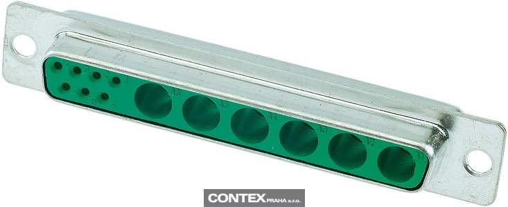 Connector, Solder cup termination, Rated current: 5 A, Female, Size: D-Sub 4, Thermoplastic resin, glass-fibre filled (Polyester), Shell: steel, tin plated, Green, Contacts: 13, Conductor cross-section: 0.5 mm², Copper alloy, Noble metal over Ni