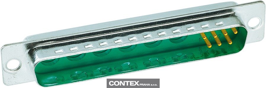 Connector, Solder cup termination, Rated current: 5 A, Male, Size: D-Sub 4, Thermoplastic resin, glass-fibre filled (Polyester), Shell: steel, tin plated, Green, Contacts: 13, Conductor cross-section: 0.5 mm², Copper alloy, Noble metal over Ni