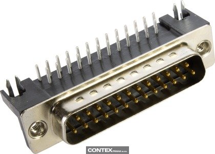 Connector, U.S. Footprint, Wave soldering termination, Rated current: 6.5 A, Male, Size: D-Sub 3, Thermoplastic resin, glass-fibre filled (PBTP), Shell: Plated steel, Black, Contacts: 25 With grounding pin, Copper alloy, Noble metal over Ni