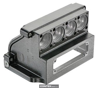 Bulkhead mounted housing, Angled, 4x SP1, Size: 24 HPR, SP1, Screw locking, for 1x 24 HPR, Material (hood/housing): Aluminium die-cast, Corrosion resistant, Powder-coated, RAL 9005 (jet black), Material (seal): NBR