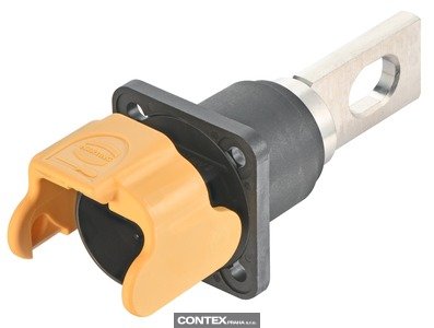 Bulkhead mounted housing, incl. male contact with busbar termination, With unlocking protection, Single locking lever, Material (hood/housing): Polyamide (PA), RAL 9005 (jet black)