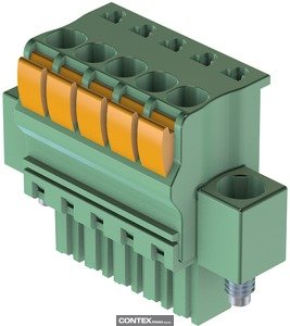 Connector, Horizontal, Push-in-spring-cage termination, Rated current: 11 A, Contacts: 5, Copper alloy, Sn Mating side, Coding: Please order coding pins separately., PCB fixing: With screw flange, Polyamide (PA), Polyphthalamide (PPA), Green