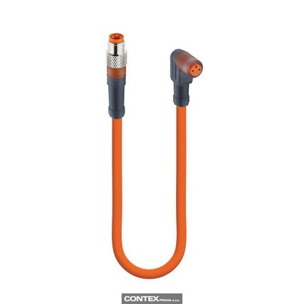 Sensor/Actuator Double-Ended Cordset: Male straight A-coded translucent 3-pin M8 Standard connector to female angled A-coded translucent 3-pin M8 Snap-In connector, 50 V AC / 60 V DC, 4 A; PVC orange cable, 3-wires, 0.34 mm²
